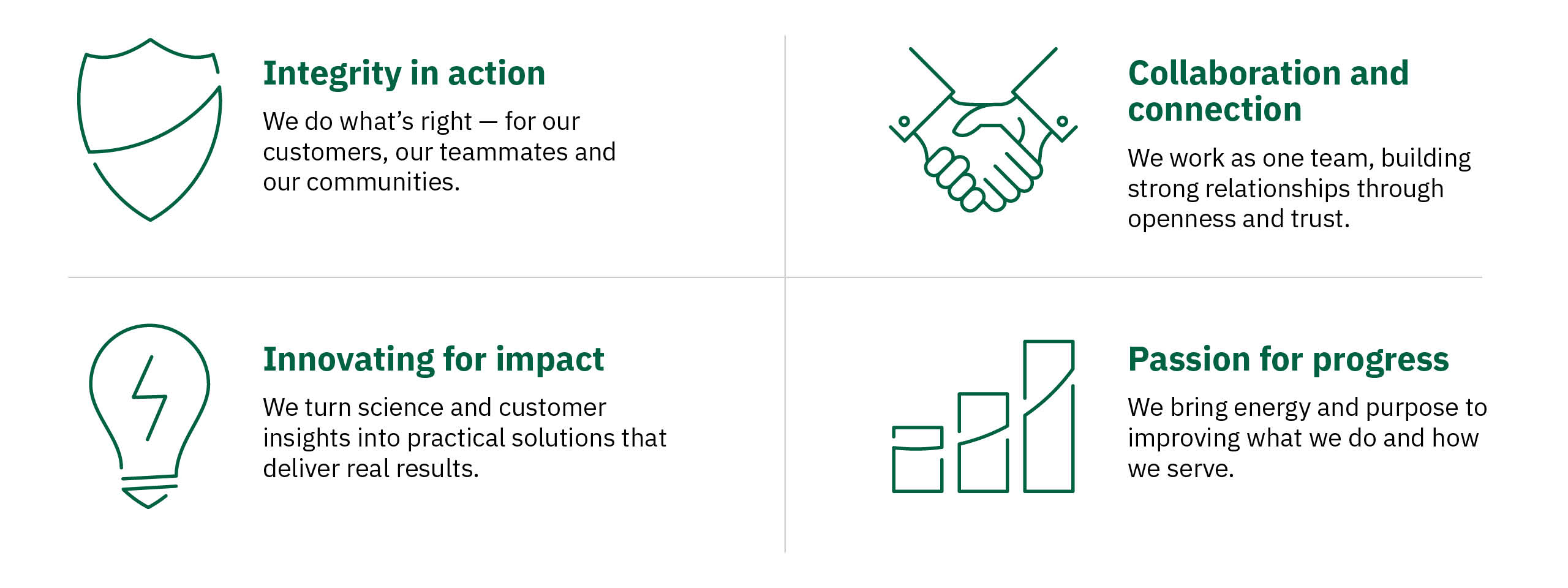 Our values shape who we are and how we show up — in our work, our partnerships and the results we deliver. They shape how we innovate, collaborate and serve — ensuring that every interaction, every solution and every partnership reflects our commitment to becoming the most trusted name in animal nutrition.